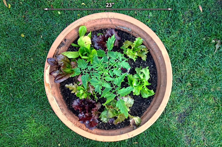 23″ pot garden – recommended: 10+ different lettuces/herbs + tomato plant in the middle