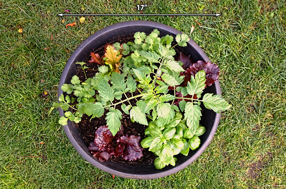 17″ pot garden – recommended: 6-7 different lettuces/herbs + tomato plant in the middle
