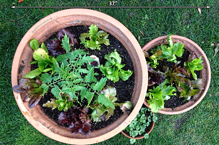 If you have the room, this size pot is great because you can grow an abundance of food in one pot in less that 2 feet of space (~4 total square feet). Pictured I have my staples.. tomatoes and lettuces, but you can also add a variety of herbs as well, maybe add a kale plant for juicing, or even sprinkle some carrot and beet seeds in the nooks and crannies and watch them emerge down the road (this is actually fun to do and a neat one if you have kids- you almost forget where you planted different seeds and then all of sudden they emerge.. almost like a surprise).