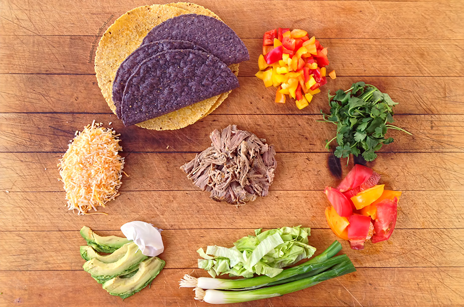 Pictured above I’ve got chopped fresh rainbow bell peppers, cilantro, chopped rainbow tomatoes, chopped green leaf lettuce, scallion, avocado, cultured sour cream (I like Nancy’s), organic mexi-blend cheese and sprouted corn tortillas & blue taco shells by Food for Life.