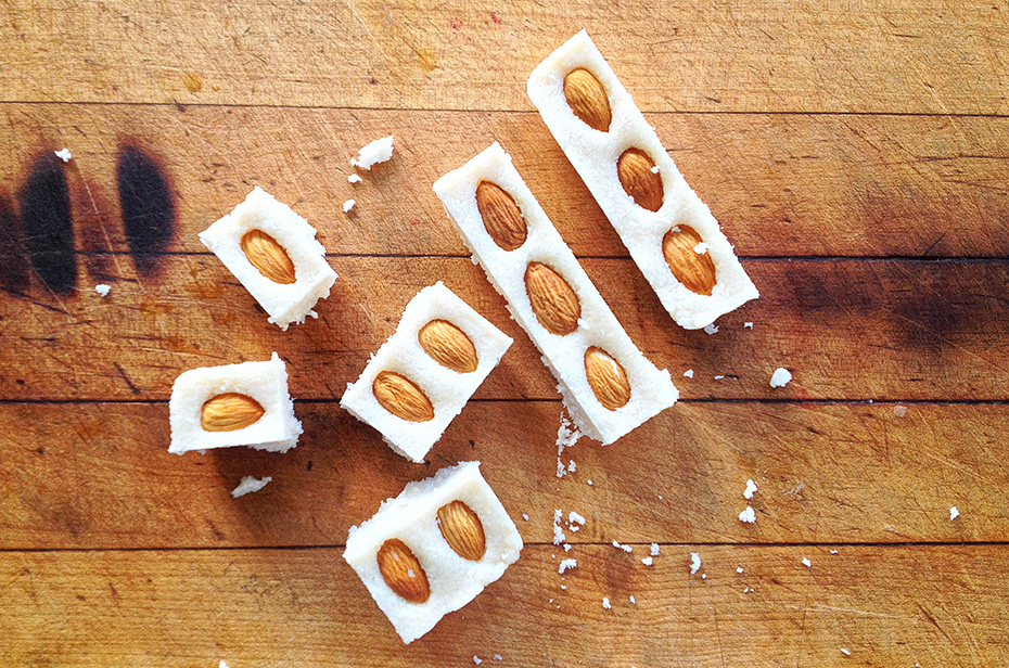 4. Add your raw almonds, keeping in mind alignment when you cut the candies (see above, right)