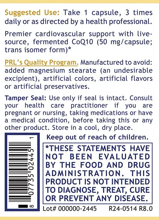 This product features premier quality Coenzyme Q10 (50 mg/cap) which is derived from a natural fermentation process (not synthetic CoQ10). This form of CoQ10 is fat-soluble and is identical to the CoQ10 that is naturally produced by cells in the body. Live-source, “trans” isomer CoQ10 is preferred to synthetic, “cis” isomer CoQ10 in long term use.