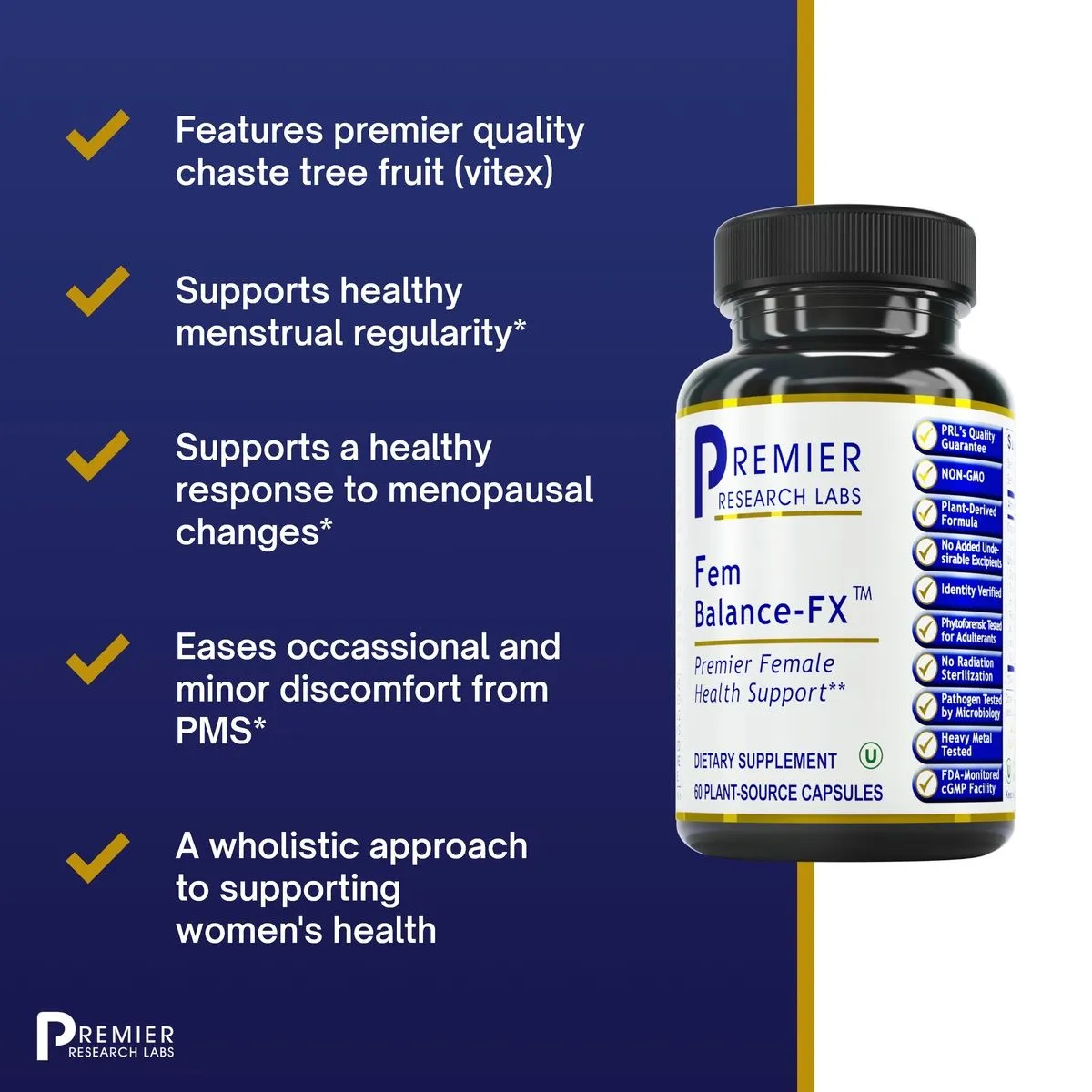 Fem Balance-FX™ is a premier nutraceutical supplement designed to support women’s health by promoting healthy menstrual cycles and regularity. It features a high-quality formula that includes chaste tree fruit (Vitex agnus-castus), a key herb known for its benefits in women’s health. Additionally, it delivers a full-spectrum botanical formula, the Ultra-Fem Support Blend™, providing comprehensive nutritional support.